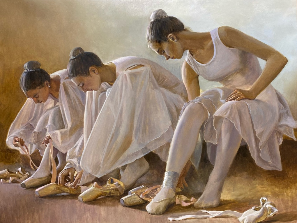 This painting privileges the moment before performance: three ballerinas bent over their pointe shoes, absorbed in a quiet, almost ceremonial preparation. The composition runs on a strong diagonal, translating concentration into structure; lowered faces and restrained gestures keep the narrative anchored in hands, ribbons, and fabric rather than theatrical display. A soft, diffused light models form through nuanced warm–cool transitions, while the whites of tulle and tights become a showcase for finely calibrated translucency and tonal control. Symbolically, the scene speaks to the cost of perfection—the unseen labor behind stage glamour and the delicate balance between the body’s limits and the ideal it pursues. For collectors, the work offers a compelling combination of intimacy and universality: an iconic ballet subject rendered with a polished, gallery-ready finish. Its tasteful palette and recognizable motif make it highly installable in both classic and contemporary settings, with strong appeal for figurative art buyers and institutions seeking culture-adjacent themes without overt narrative excess.