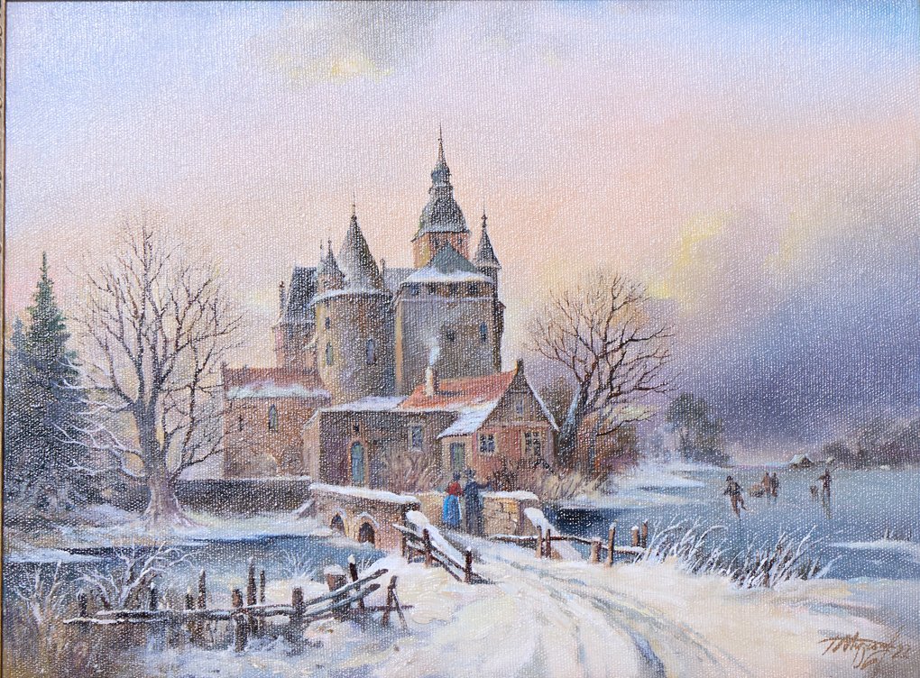 Sergey Frolov delivers an intimate yet commanding winter landscape in which a riverfront castle anchors the scene as both architectural centerpiece and metaphor for endurance. The painting’s market appeal lies in its assured harmony of temperature: warm stone and roof ochres set against a cool veil of sky and frozen water, producing a refined, collectible balance between nostalgia and grandeur. Frolov’s handling is deliberately soft—atmospheric perspective, controlled half-tones, and a nuanced, tactile treatment of snow prevent the surface from collapsing into flat whiteness. Small figures on the bridge and on the ice function less as narrative than as scale markers, lending human cadence while preserving the work’s dominant mood of hushed winter stillness. The composition reads clearly at distance, making it exhibition-friendly, while close viewing rewards with subtle color transitions and crisp edges where frost meets masonry. For collectors, it offers a classically legible “Old World” romanticism with disciplined technique and strong decorative presence—an accessible entry point into representational landscape collecting with enduring interior compatibility.