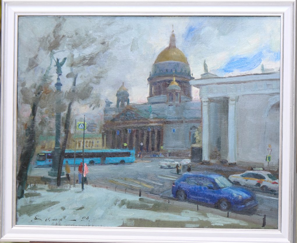 The cityscape captures St Petersburg in the shifting winter light of a thaw. Rising above the moist air and the blurred silhouettes of trees is the majestic dome of the cathedral, while nearby the strict classical form of a monumental portico unfolds. The artist constructs the composition as a subtle dialogue between the eternal and the transient: historic architecture becomes the stable axis of the scene, while buses and automobiles introduce the restless rhythm of contemporary urban life. The painterly manner is built on a confident, free brushstroke and a restrained tonal palette. Semi-transparent layers of paint evoke the damp atmosphere, winter haze and soft reflections on the wet asphalt. Cool blue-grey tones are balanced by the warm golden glow of the dome — a symbol of permanence, light and the spiritual centre of the city. The work appeals to collectors for its recognisable vision of St Petersburg without postcard-like literalness. It presents a vivid and atmospheric view of the city, where historical grandeur meets the pulse of modern life, making the painting well suited for both private collections and corporate holdings of urban landscape art.