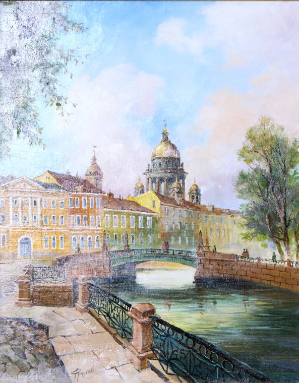 In this cityscape, Sergey Frolov treats the unmistakable silhouette of St Isaac’s Cathedral and the St Petersburg embankments as an emblem of endurance and cultural memory. The composition is driven by a diagonal: the granite parapet and ornate railing pull the eye toward the bridge and onward to the gilded dome—positioned as a visual and symbolic “beacon” anchoring the city. A luminous, transparent palette and softly graded sky convey a poised, early-day hush, while the canal becomes a metaphor for time: it mirrors architecture without ever holding it still, suggesting gentle, continuous change. The handling feels watercolor-like in its air and moisture, yet the surface retains enough texture to read as clearly handmade, with an assured, unforced tempo of mark-making. Market-wise, the piece sits confidently within the contemporary Petersburg veduta tradition—highly legible geography, calm museum tonality, and strong interior appeal—qualities that tend to perform well with collectors seeking refined, recognizable urban icons rather than overt narrative.