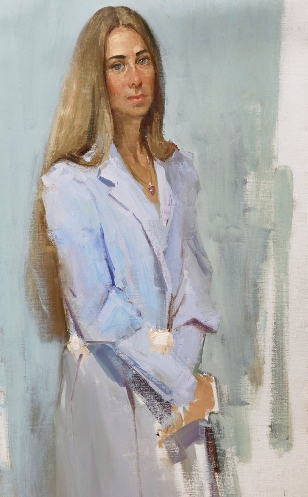 We are looking at a portrait of a young girl with long blonde hair, wearing a blue dress. The model is looking directly at the viewer: her gaze conveys quiet confidence rather than a display of emotion. The key element is the blue dress, painted with broad brushstrokes — it can be interpreted as a symbol of purity and personal freedom. The background is deliberately blurred and rendered in shades of blue‑gray; it creates a sense of distance rather than depicting a specific location. Thanks to this approach, the image feels universal and can easily fit into any interior. The combination of warm skin tones and cooler tones in the fabric brings the portrait to life. This is a rare work in terms of its mood — a portrait without a narrative, one that invites prolonged contemplation.