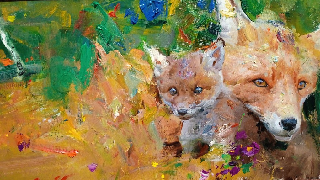 This painterly image of a fox and cub operates less as naturalistic wildlife depiction than as an emotionally charged study of intimacy, protection, and instinct. The artist deliberately suspends the boundary between representation and abstraction: the animals’ faces anchor the composition while the surrounding field dissolves into animated passages of green, ochre, blue, and peach. That tension gives the work its vitality, suggesting both tenderness and alertness in a world that feels constantly in motion. Thick, tactile brushwork, visible revisions, and chromatic fragmentation lend the surface a persuasive contemporary energy and make the painting highly legible at a glance—an asset in both exhibition and private collection settings. From a market perspective, the piece is especially appealing for collectors drawn to modern animal imagery that balances decorative richness with psychological resonance. Symbolically, the fox is handled here not as folklore cliché but as a vehicle for adaptability, intelligence, and maternal vigilance rendered through an expressive, color-driven language.